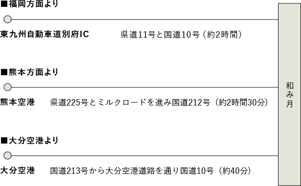 自大分機場出發,經國道213號線與大分機場道路,行駛國道10號線,約40分鐘